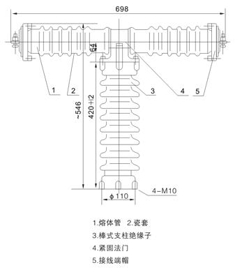 河間市天恒電力器材有限公司生產(chǎn)的熔斷器由熔體管、瓷套、緊固法蘭、棒形支柱絕緣子和接線端帽等組成。用壓裝的方法將兩端的接線端帽和熔體管固定在瓷套內(nèi)、然后用堅(jiān)固法蘭把瓷套固定在棒形支柱絕緣子上,其結(jié)構(gòu)說明和外形尺寸如圖所示。