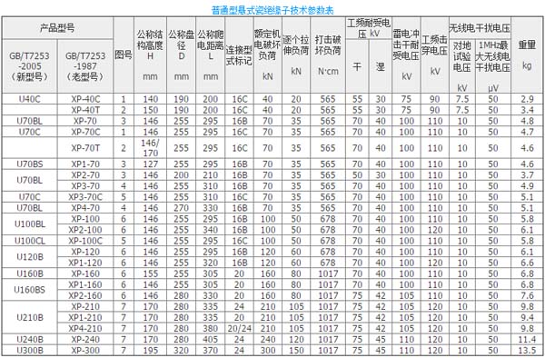 XP—以機電破壞負荷表示的普通型懸式瓷絕緣子;X—以一小時機電負荷表示的普通型懸式瓷絕緣子,其右下角數字為設計順序號,數字70、80、100、120、160、210、300為額定機電破壞負荷(KN);3、4.5為一小時機電實驗的機械負荷(t),C—槽型鏈接(球形鏈接不表示)。
